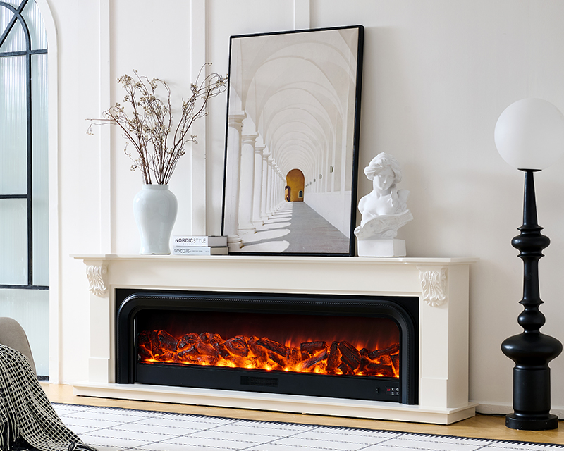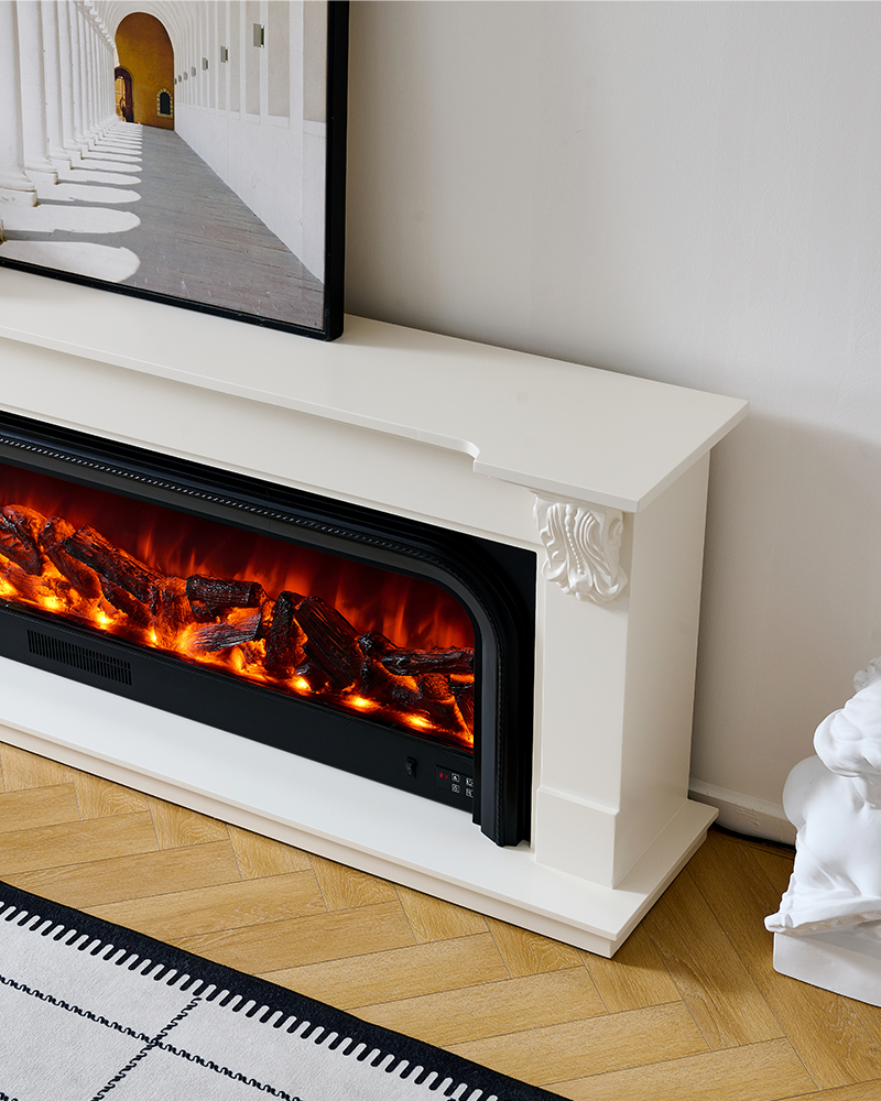 Grynai balta apdaila su juodu dervos rėmu ir raižytomis šoninėmis panelėmis, ji derina modernų šiaurietišką dizainą su rafinuotu meistriškumu. Pažangus LED įdėklas skleidžia tikroviškas liepsnas ir žėrinčią žarijų lovą, o platus viršutinis paviršius palaiko standartinius televizorius ir medijos įrenginius.